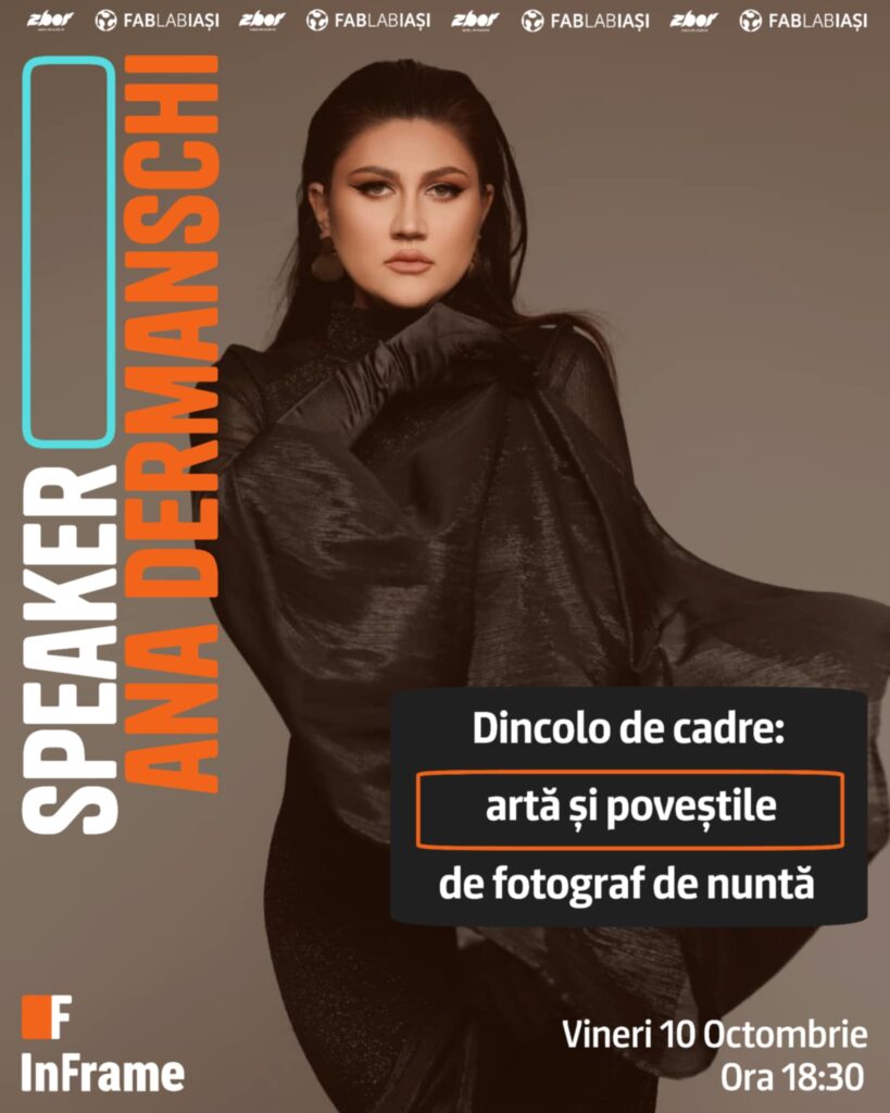 - Ana Dermanschi, fotograf de nuntă și familie cu peste 16 ani de experiență, 170 de premii câștigate și un studio creat împreună cu soțul ei, Vlad. Tema sa, „Dincolo de cadre: artă și poveștile de fotograf de nuntă”, va aduce o perspectivă autentică despre creativitate, conexiuni umane și drumul personal al unui artist.