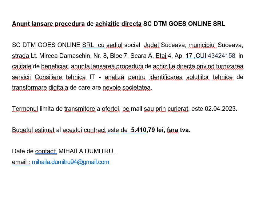 Anunt lansare procedura de achizitie directa SC DTM GOES ONLINE SRL