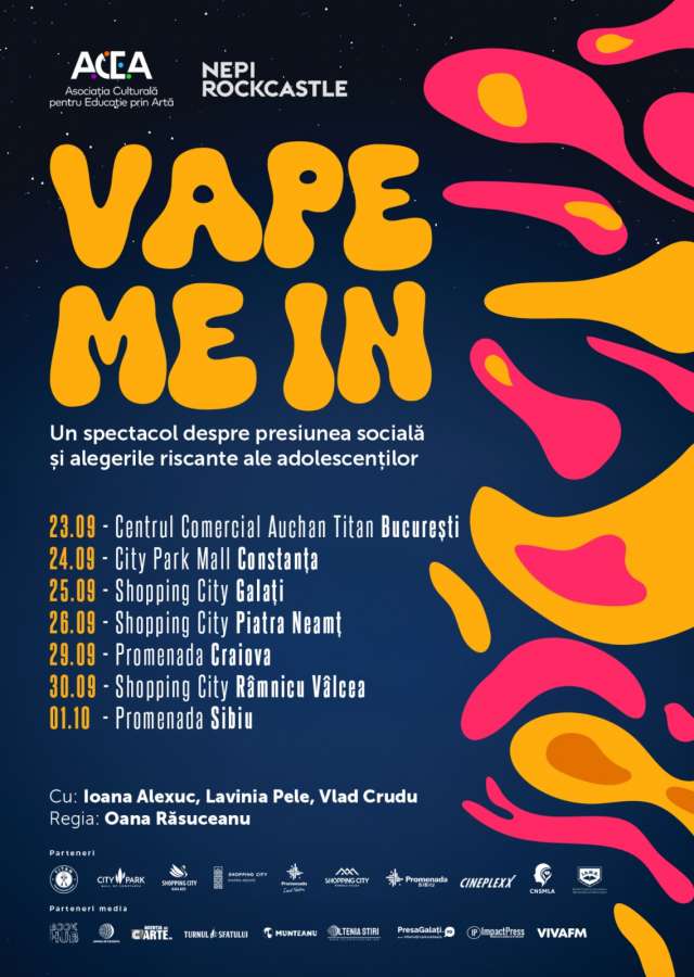 Spectacolul de teatru „Vape me in” ajunge astăzi la Piatra Neamț, în cadrul unui turneu național, inițiat de Asociația Culturală pentru Educație prin Artă, care explorează provocările adolescenței și riscurile consumului de substanțe periculoase.
