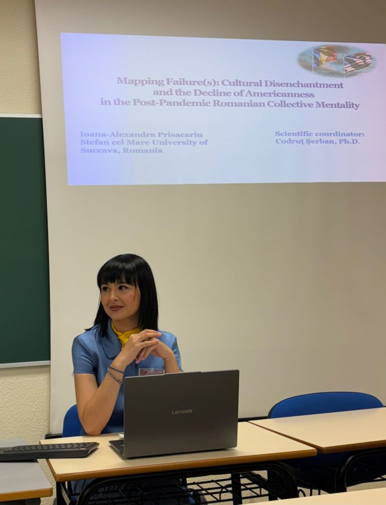 USV a fost reprezentată de drd. Anton Zazuleac, cu lucrarea intitulată „Friendship as the new ‘Home’: Identity and belonging in the Pixar animated film Luca” (coordonator prof.univ.dr.habil. Gina Măciucă), drd. Ion Lunga, cu lucrarea intitulată „From Battlefield to Exile: The Deconstruction of Identity in All Quiet on the Western Front and Love Thy Neighbor” (coordonator conf.univ.dr. habil. Raluca Dimian), și masteranda Ioana-Alexandra Prisacariu, de la programul English in the Digital Age, cu lucrarea „Mapping Failure(s): Cultural Disenchantment and the Decline of Americanness in the Post-Pandemic Romanian Collective Mentality”, pregătită sub îndrumarea lector univ. dr. Codruț Șerban. Totodată, menționăm faptul că Ioana-Alexandra Prisacariu a fost și moderatoarea uneia dintre secțiunile conferinței, Identity, Media and Spectatorship.