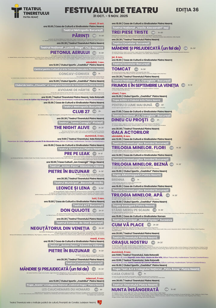 Cea de-a 36-a ediție a Festivalului de Teatru Piatra Neamț se va desfășura între 31 octombrie și 9 noiembrie, perioadă în care vor fi prezentate spectacole, lansări de carte și întâlniri cu artiștii.