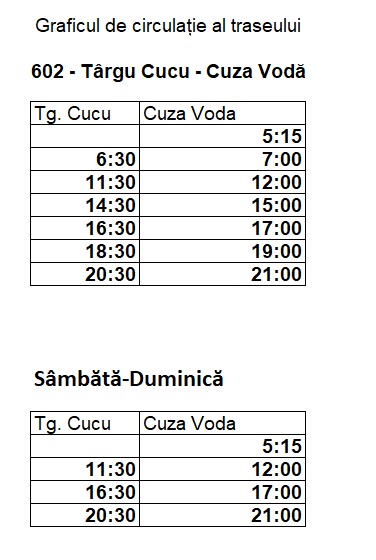Rutele standard ale traseului 54 străbat Str. Brândușa – Str. Ursulea – Str. Caprelor – Sărărie – Târgu Cucu, cu retur la ore fixe și la jumătate. Traseul extins 602 va permite pasagerilor să ajungă direct în satul Cuza Vodă fără schimbări de autobuz.