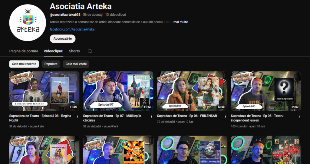 Asociația Arteka s-a înființat cu scopul de a realiza și desfășura proiecte si programe culturale dedicate tinerilor, dar și pentru a oferi suport artiștilor aflați la început de carieră prin oferirea unui context de dezvoltare personală și profesională. În anul 2024 Asociația Arteka a început producerea și implementarea proiectului cultural Supradoza de Teatru, o serie de episoade tip vlog de critică teatrală dedicate publicului tânăr, proiect aflat în desfășurare și în anul 2025.