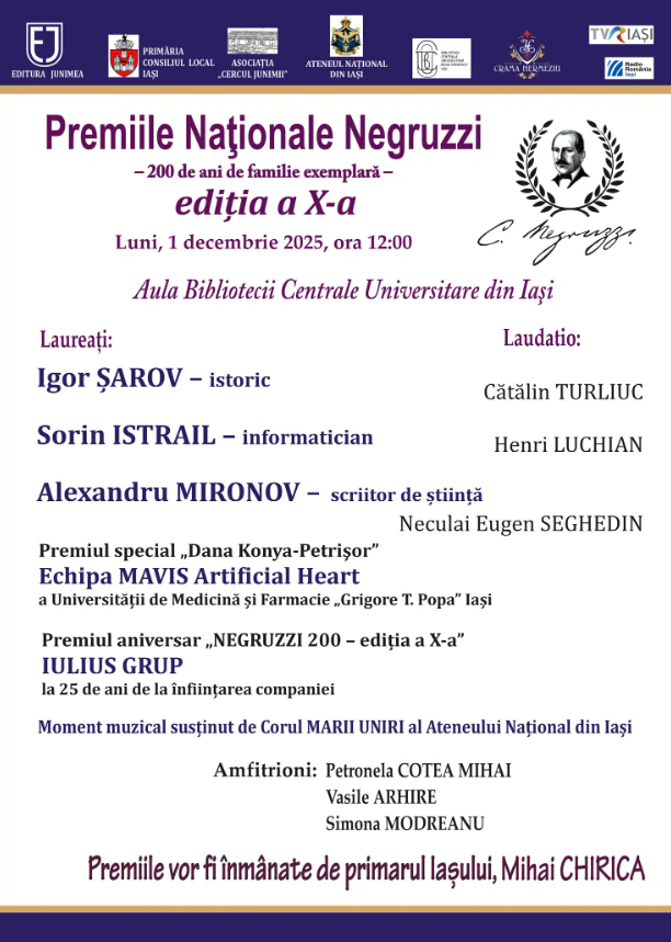 Premiul aniversar „NEGRUZZI 200 – ediția a X-a” va fi decernat antreprenorului Iulian Dascălu, fondator IULIUS Grup, la 25 de ani de la înființarea companiei.