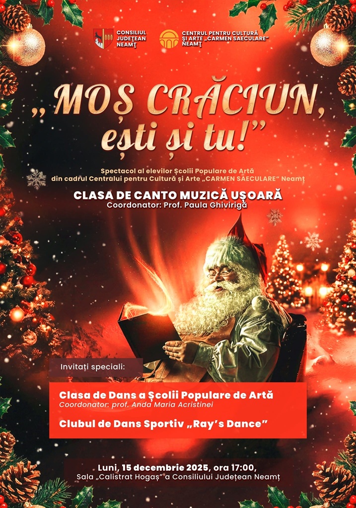 Centrul pentru Cultură și Arte „Carmen Saeculare” Neamț, prin Clasa de canto – muzică ușoară a Școlii Populare de Artă organizează astăzi concertul „Moș Crăciun ești şi tu!”, dedicat sărbătorilor de iarnă.