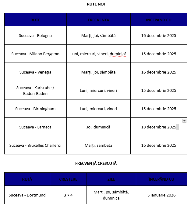 Începând din această săptămână, pasagerii pot zbura din Suceava către Bologna, Milano, Veneția, Karlsruhe, Birmingham, Larnaca și Bruxelles. În luna ianuarie, Wizz Air va crește și frecvența zborurilor pe ruta către Dortmund, ajungând la patru zboruri săptămânale.