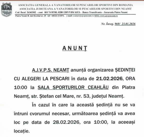 Asociația Județeană a Vânătorilor și Pescarilor Sportivi Neamț aduce la cunoștința tuturor membrilor pescari organizarea sedinței cu alegeri, care va avea loc în data de 7 februarie, începând cu ora 10, la Sala Sporturilor Ceahlăul din municipiul reședință.