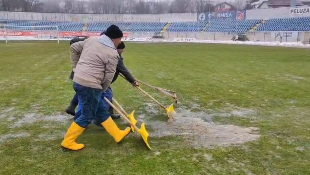 Mai mult, întrucât sunt prognozate precipitații sub formă de ninsoare în perioada următoare, s-a decis utilizarea foliei de protecție pe suprafața gazonului.