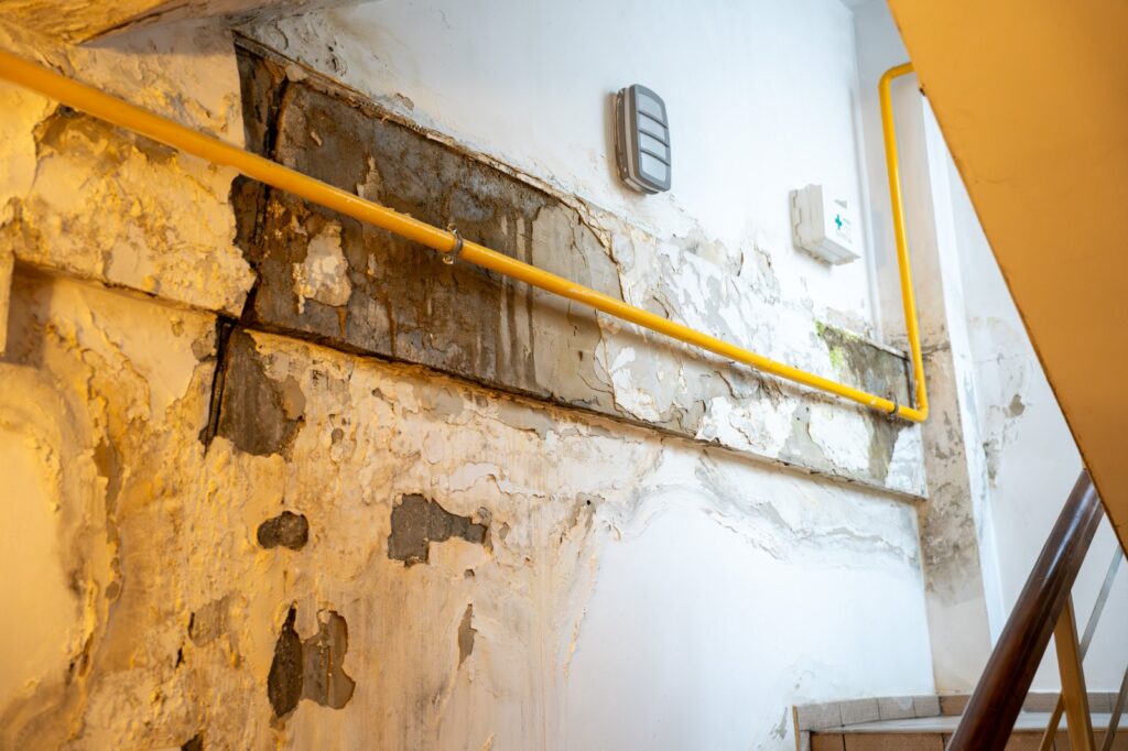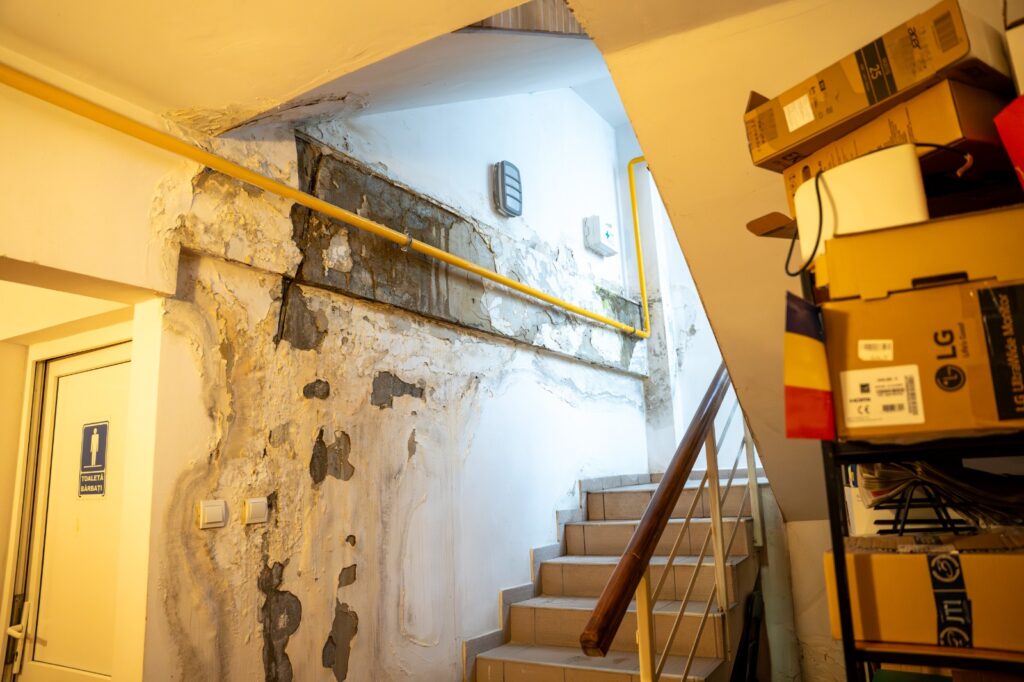 Clădirea se află într-un stadiu avansat de degradare atât la exterior, cât și la interior din cauza infiltrațiilor de apă.