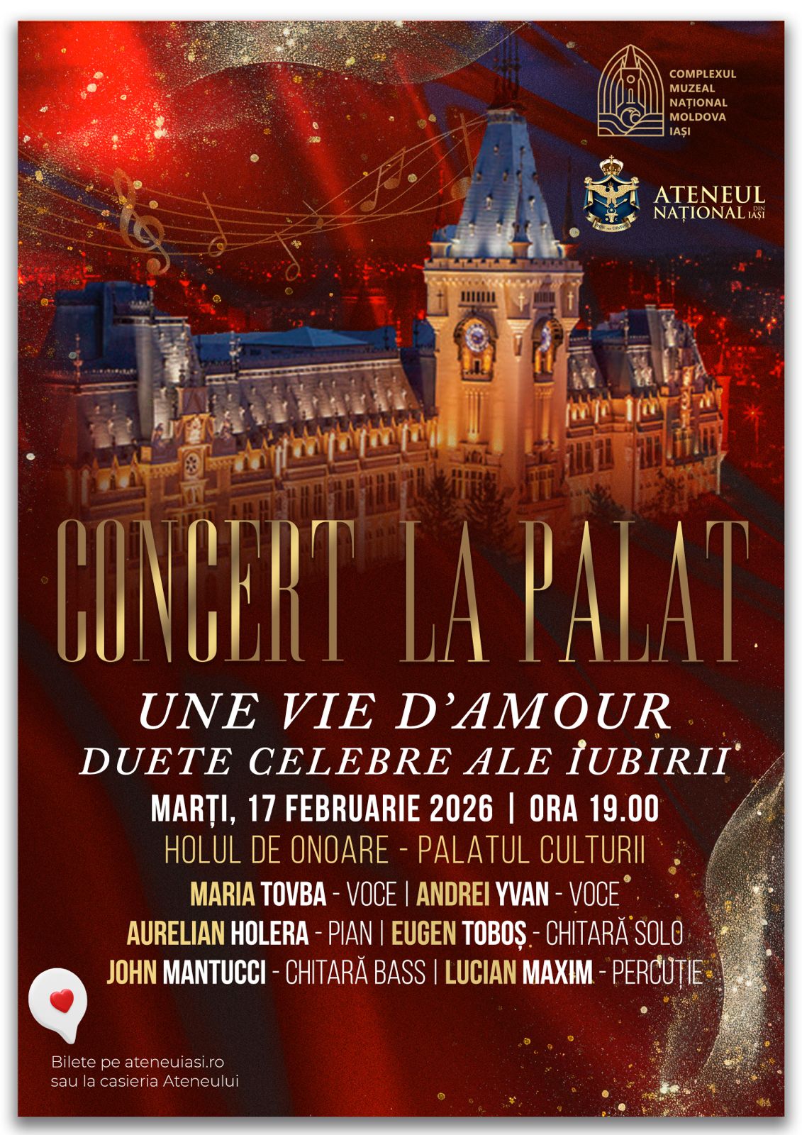 În data de 17 februarie 2026, sunteți așteptați la spectacolul „Une vie d’amour”, o celebrare a sentimentelor tradusă într-o formulă vocal-instrumentală complexă. Scena va aparține artiștilor Maria Tovba și Andrei Yvan (voce), alături de talentații instrumentiști Aurelian Holera (pian), Eugen Toboș (chitară solo), John Mantucci (chitară bass) și Lucian Maxim (percuție). Întregul program este conceput ca o fuziune rafinată de muzică ușoară și pop opera, oferind publicului o colecție de duete de dragoste celebre, interpretate cu o sensibilitate aparte.