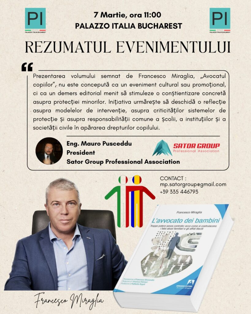 În 7 martie acest an, a avut loc la București lansarea unei cărți inedite cel puțin în spațiul românesc. Este vorba despre volumul scris de italianul Francesco Miraglia ,,Avocatul copiilor“, o apariție editorială menită să conștientizeze necesitatea protejării minorilor într-un context global tot mai complex. Fațetele agresiunii contra copiilor au devenit foarte nuanțate odată cu generalizarea accesului la internet.