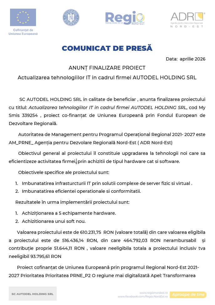 Acasă / Știri / ANUNȚ FINALIZARE PROIECT Actualizarea tehnologiiIor IT in cadrul firmei AUTODEL HOLDING SRL