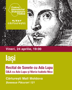 La Iași, pe 24 aprilie, „Galeria Shakespeare: Sonete itinerante” ajunge la Cărtureși Mall Moldova, în intervalul 19:00–20:00, unde Recitalul de Sonete va fi susținut de actrița Ada Lupu, urmat de o sesiune de QAs cu Ada Lupu și Maria-Isabela Nica.