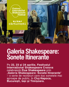 Festivalul Internațional Shakespeare Craiova invită publicul la „Galeria Shakespeare: Sonete itinerante”, o serie de recitaluri organizate în parteneriat cu Librăriile Cărturești, în perioada 22–24 aprilie 2026, în mai multe orașe din țară, cu ocazia Zilei Shakespeare.
